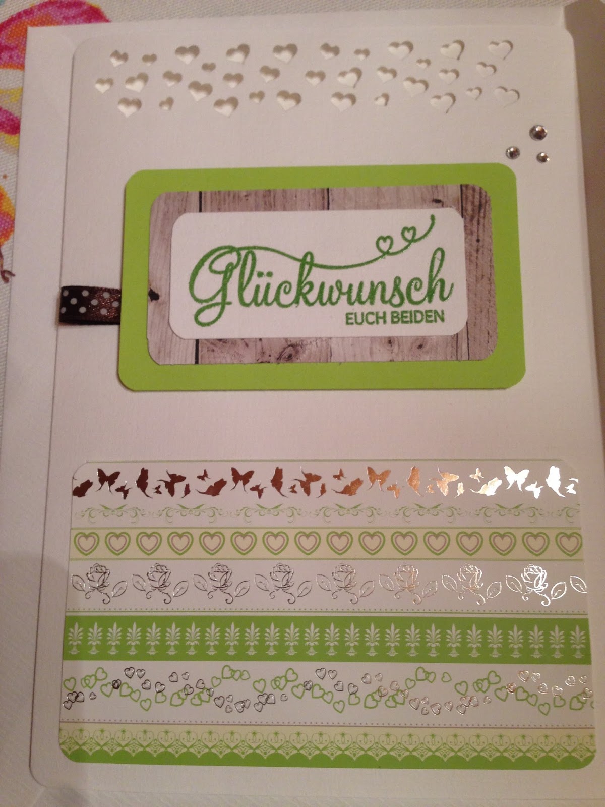 An einem Abend waren drei wunderschöne individuelle Hochzeitskarten fertiggestellt.... kurz bevor ich die vierte montieren wollte, kam per WhatsApp die Anfrage ob ich wüsste das das Fest auch gleichzeitig die Taufe der kleinen Hanna beinhalte?.... Oje, was nun auf allen dreien war der schöne Gruss "Glückwunsch euch beiden" gestempelt....ich schickte erstmal die drei Werke per WhatsApp zurück und schrieb das ich mir über die Kombination Gedanken machen wolle...